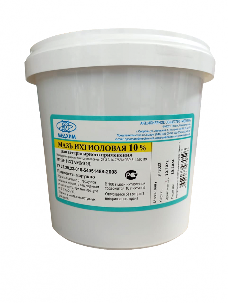 Мазь ихтиоловую 10% применяют животным (кроме кошек) при заболеваниях кожи (экземы, дерматиты).